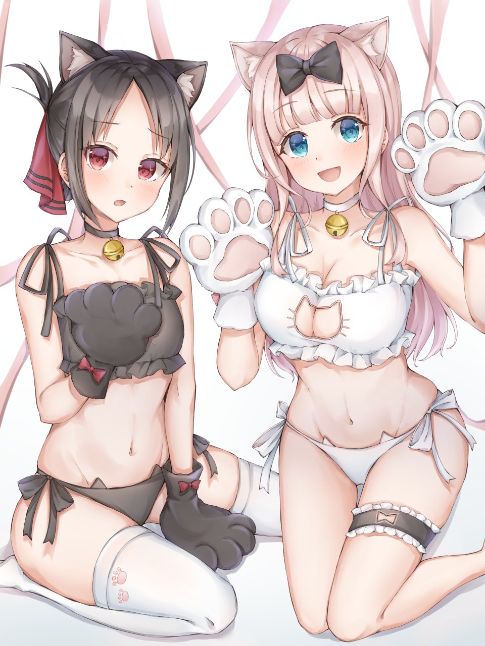【插画/CG】图片艺术作品#23142(PNG/3000x4000/7.82MB);是由作者「ポー (poe)」创作;图中角色有「四宫辉夜」「藤原千花」等;关联标签:藤原千花,四宫辉夜,兽耳,前发,铃,黑发,碧眼,直刘海,bra,胸部,猫耳,cleavage,手套,巨乳,长发,视线正对,露脐,開いた口,胖次,粉发,红色眼,缎带,短发,笑顔,黑丝,结发,下着,白背景,白丝,fujiwara chika,shinomiya kaguya,animal ears,bangs,bell,black hair,blue eyes,blunt bangs,nekomimi,gloves,large breasts,long hair,looking at viewer,navel,open mouth,pantsu,pink hair,red eyes,ribbons,short hair,smile,black legwear,tied hair,underwear,white background,white thighhighs